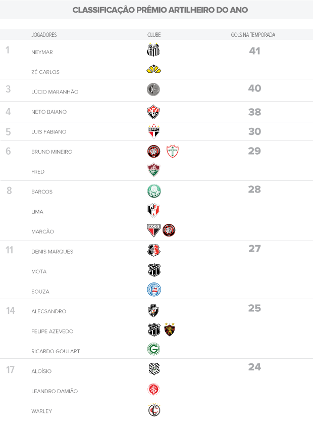 Antes ofuscado pelos bons momentos de Neymar e Lúcio Maranhão, o goleador da Série B voltou a dar o ar do graça e aproveitou que os rivais passaram em branco na semana. Zé Carlos deixou o dele na vitória do Criciúma sobre o América-RN por 4 a 1, no sábado, e chegou 41 gols na temporada, empatando com o atacante do Santos na liderança do Artilheiro do Ano. O ídolo do Criciúma, porém, terá apenas duas rodadas pela frente até o fim da competição, enquanto o craque santista ainda pode jogar mais três vezes na Séria A. Vale lembrar que o recorde do prêmio é de 42 gols marcados, em 2010, alcançado por Jonas e Neymar.