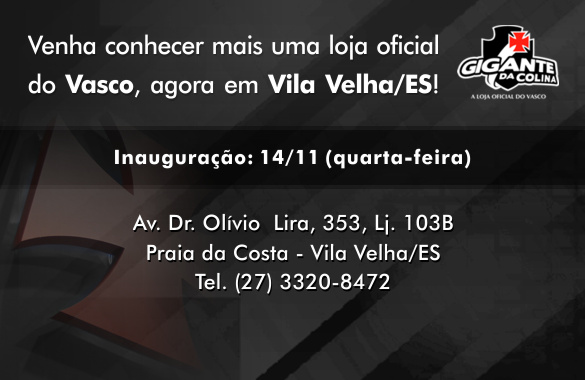 Os vascaínos do Espírito Santo terão mais uma loja oficial à disposição. Além da Gigante da Colina de Vitória, os torcedores de Vila Velha agora poderão comprar os produtos oficiais do clube na franquia de Vila Velha, que será inaugurada na próxima quarta-feira (14/11), às 10h.