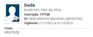 Novo contrato de Dedé com o Vasco é publicado no BID da CBF