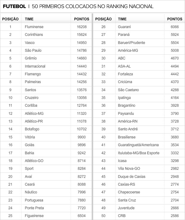 O Fluminense é o primeiro do Brasil. A afirmação a seguir pode parecer uma constatação do título do Campeonato Brasileiro conquistado pelo time no último domingo após vencer o Palmeiras por 3 a 2, em Presidente Prudente. Mas não, não é isso. A afirmação é referente ao novo Ranking Nacional de Clubes da CBF. A divulgação oficial da entidade sairá após o término das competições nacionais, e baseado no novo critério adotado, o GLOBOESPORTE.COM fez as contas, chegando aos 16.208 pontos alcançados pelo Tricolor.