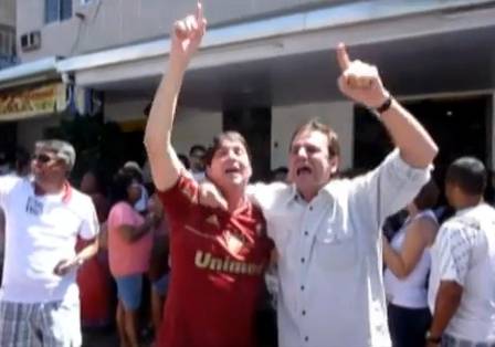 ![]() O prefeito do Rio, Eduardo Paes, canta o hino do Fluminense | ![]() Eduardo Paes posa com torcedores do Fluminense |