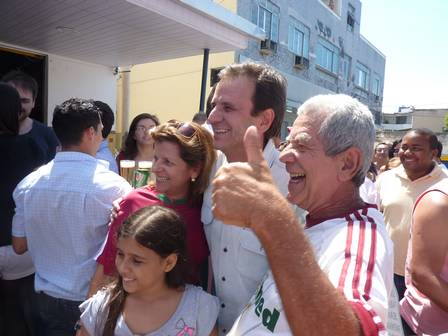 Vascaíno assumido, o prefeito do Rio, Eduardo Paes, embarcou no clima da comemoração pela conquista do tetracampeonato do Fluminense, poucas horas antes do jogo contra o Cruzeiro. Ao lado do vice-governador, Luiz Fernando Pezão, e do deputado federal Pedro Paulo, ele almoçava, neste domingo, em um bar na Zona Norte do Rio, próximo ao Engenhão, quando foi contagiado pela animação dos tricolores. Empolgado, Paes se juntou ao grupo, cantou o hino do Fluminense e posou para fotos ao lado dos torcedores.