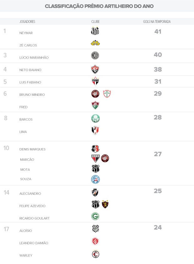 Neste fim de semana, os principais candidatos ao prêmio Artilheiro do Ano não tiveram um bom desempenho e passaram em branco. Apenas Luis Fabiano deixou sua marca na vitória do São Paulo sobre o Náutico por 2 a 1, no Morumbi, pela 36ª rodada do Brasileirão. Ele fez um gol e sofreu o pênalti, que originou a virada tricolor. Assim, o camisa 9 alcançou o registro de 31 tentos na temporada, sendo, portanto, o quinto colocado do ranking. Neymar, Zé Carlos e Lúcio Maranhão formam o Top 3 e seguem como grandes favoritos à honraria.
