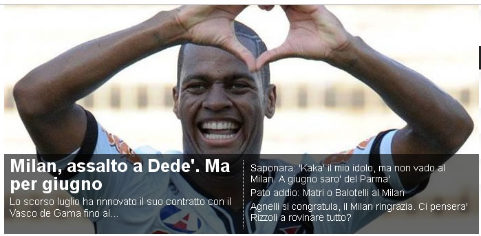 L'ostacolo più grande è rappresentato dalle richieste esorbitanti del Vasco de Gama, pronto a trattare con un'offerta di base di 15 milioni di euro, il Milan in attesa di capire se arriveranno capitali freschi da investitori stranieri per il "nuovo Thiago Silva" sta lavorando sull'ipotesi prestito con diritto di riscatto, forte della disponibilità del giocatore a trasferirsi a Milano. La seconda serie della telenovela "Dedé al Milan" è iniziata, Galliani spera che il finale sia diverso.