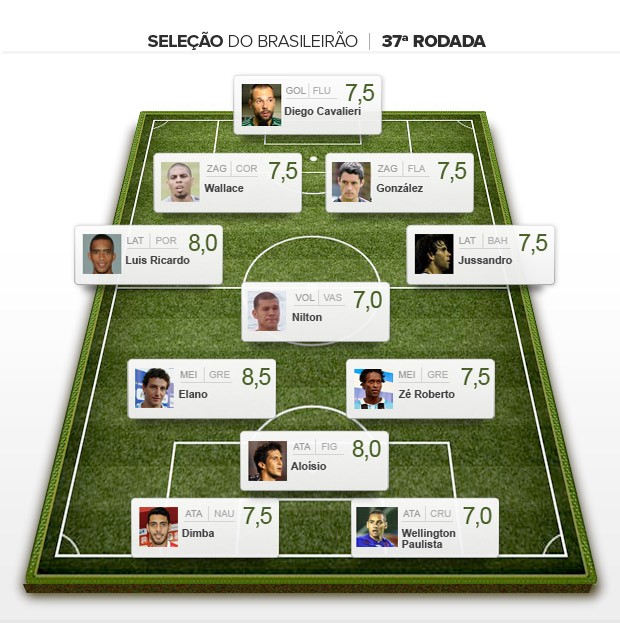 Zé Roberto não deixou por menos. Com uma participação destacada, balançando a rede e dando inclusive o passe para o gol de Elano, ele recebeu 7,5 e forma o meio de campo com o colega de equipe. Do outro lado, o autor dos gols do Figueirense também entrou na seleção da 37ª rodada. Aloísio, que chegou a pedir silêncio aos gremistas presentes no Orlando Scarpelli, balançou a rede duas vezes e ficou com 8,0. Dimba e Wellington Paulista formam o trio de ataque.