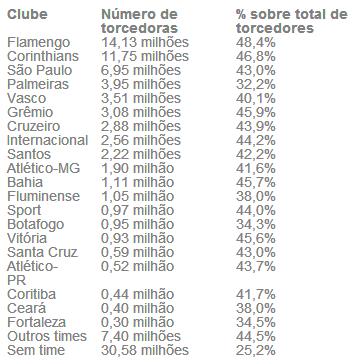 As 14,13 milhões de torcedoras do Flamengo representam 48,4% da torcida total do clube, mostrando que as mulheres representam quase tanto quanto os homens para o time Rubro Negro. Em segundo lugar está o Corinthians. O Alvinegro paulista possui 11,75 milhões de torcedoras.