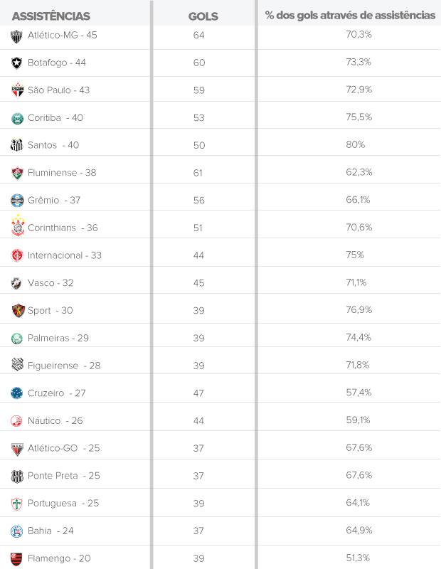 Botafogo, Coritiba, São Paulo e Santos marcaram menos gols do que o Fluminense na competição. Apesar disso, tiveram mais assistências, demonstrando que as equipes se utilizaram das jogadas trabalhadas e de passes decisivos para chegar à meta adversária. O Bota fica em segundo lugar nos passes decisivos, com 44 no total. Quem mais impressiona, no entanto, é o Peixe. Dos 50 gols da equipe, 40 foram marcados após assistências, o que resulta em um total de 80%.