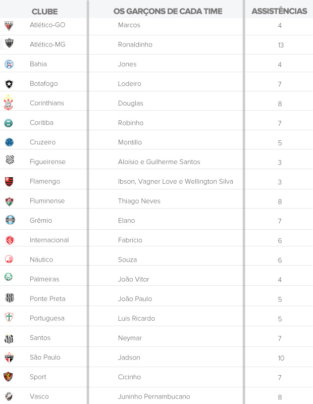 O melhor garçom da competição foi mesmo Ronaldinho Gaúcho. Após virar o primeiro turno na liderança, Jadson terminou a competição com dez passes para gol e viu o camisa 49 do Galo manter o ritmo de assistências e chegar a 13. Por outro lado, o Flamengo foi o que teve o pior aproveitamento no quesito, com apenas 20 gols marcados após passes decisivos – dois deles na última rodada – sendo 51,3% dos tentos da equipe. Veja o ranking por equipes no primeiro info. No segundo, confira a lista de principais garçons por equipe: