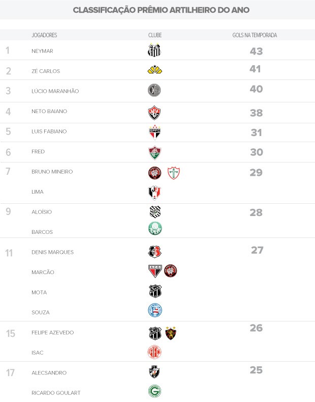 Genial, infalível, categórico e agora quebrador de recorde. Tudo isso é Neymar. Ao marcar duas vezes no triunfo do Santos por 3 a 1 sobre o Palmeiras, no último sábado, o moicano alcançou 43 gols na temporada em jogos oficiais pelo Peixe e passou a liderar o Prêmio Artilheiro do Ano na reta final da disputa. Como os principais correntes já entraram de férias, dificilmente o craque santista será ultrapassado. Será a segunda vez que o camisa 11 sairá vencedor desta corrida pelo Troféu Friedenreich. Em 2010, ele e Jonas (que era do Grêmio) haviam marcado 42 gols e obtinham a melhor marca até então.