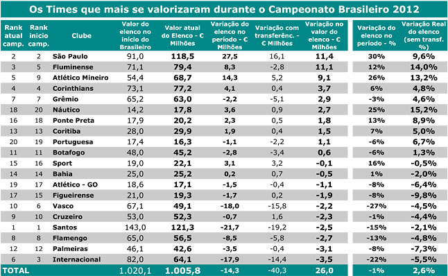 O campeão Fluminense, que tem o terceiro elenco mais valioso (atrás de Santos, o líder, e São Paulo), teve uma valorização de 9,6%, de € 71,1 milhões (R$ 195,7 milhões) para € 79,4 (R$ 218,5 milhões). O Galo, vice-campeão, teve uma valorização de € 9,1 milhões, ou R$ 25 milhões (26%, proporcinalmente inferior apenas à do São Paulo).