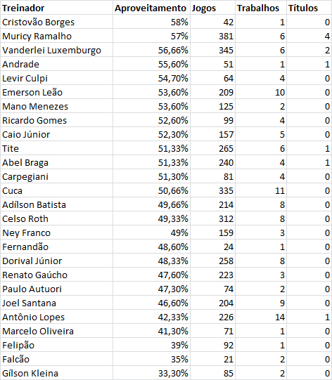 Outros quatro treinadores ganharam títulos no período dos Pontos Corridos. Andrade, com 55,6% de aproveitamento, é o quarto colocado na lista. Tite e Abel Braga, com 51,33% de aproveitamento, são o 10° e o 11° colocados na lista.