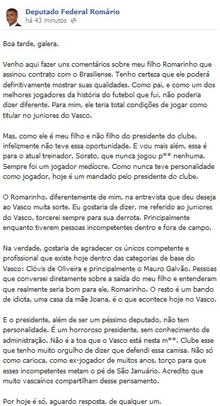 Venho aqui fazer uns comentários sobre meu filho Romarinho que assinou contrato com o Brasiliense. Tenho certeza que ele poderá definitivamente mostrar suas qualidades. Como pai, e como um dos melhores jogadores da história do futebol que fui, não poderia dizer diferente. Para mim, ele teria total condições de jogar como titular no juniores do Vasco.