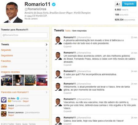 O ex-jogador Romário voltou a criticar a administração do Vasco, nesta terça-feira, por meio do Twitter. O ex-jogador reiterou as declarações que deu ao Jogo Extra, e não poupou o presidente do clube, Roberto Dinamite.