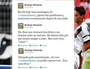 A conturbada relação de Romário e Roberto Dinamite está longe de ter uma trégua, mas os filhos deram exemplo e mostraram que não querem saber de briga. Rodrigo Dinamite postou no Twitter, na tarde desta quarta-feira, que recebeu uma mensagem carinhosa de Romarinho e agradeceu a lembrança.