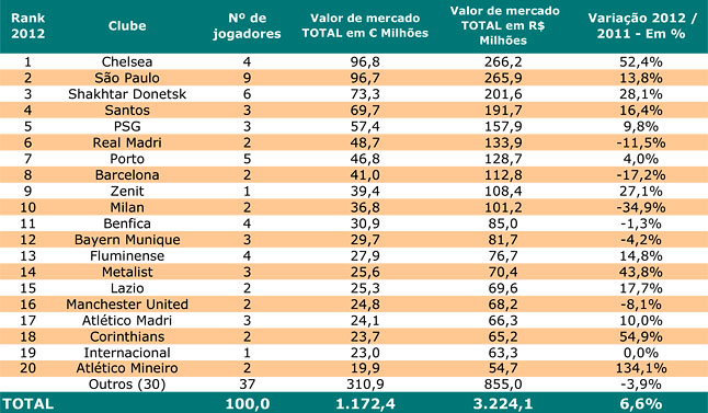 Chelsea e São Paulo são os clubes com os jogadores brasileiros mais valiosos de 2012, aponta estudo divulgado nesta quinta-feira pela Pluri Consultoria. O São Paulo tem nove jogadores na lista, mas o valor total deles (€ 96,7 milhões) fica atrás do Chelsea, que lidera a lista por clube: € 96,8 milhões, com quatro atletas - Oscar, Ramires, David Luiz e Lucas Piazón.