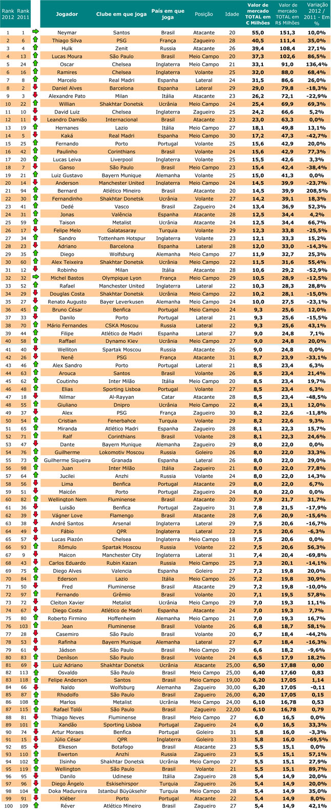 Dez clubes brasileiros estão representados na lista dos 100 mais valiosos do país: além dos já citados São Paulo e Santos, estão lá Atlético-MG (Bernard/21º e Réver/100º), Botafogo (Elkeson/92º, negociado com o futebol chinês), Corinthians (Paulinho/16º e Ralf/52º), Flamengo (Vágner Love/62º), Fluminense (Wellington Nem/60º, Fred/71º, Jean/76º e Thiago Neves/88º), Grêmio (Fernando/72º), Internacional (Leandro Damião/12º) e Vasco (Dedé/23º).
