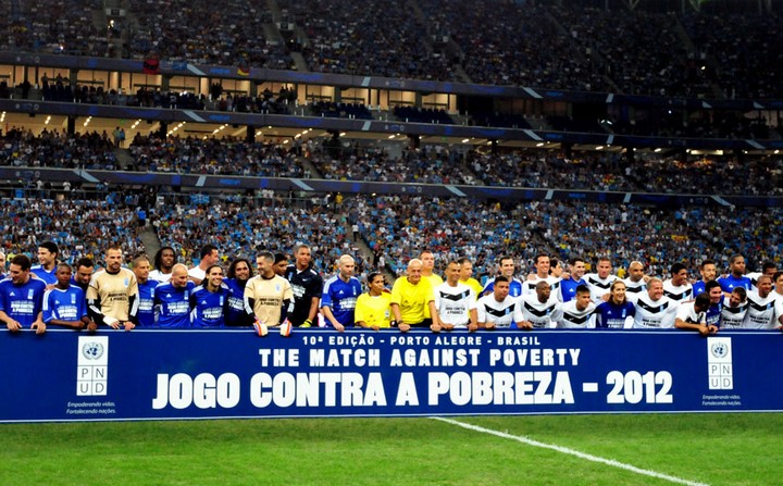 Uma grande festa. Foi assim o Jogo Contra a Pobreza, na Arena do Grêmio, na noite desta quarta-feira. Com bom público no novo estádio gremista, os craques desfilaram sua qualidade com jogadas de efeito em Porto Alegre. O time de Ronaldo acabou com o jejum de vitórias e venceu o de Zidane por 3 a 2, com gols de Bebeto, Cacá Ferrari e Leandro Damião para os Amigos de Ronaldo. A equipe de Zidane fez dois com o jogador de futsal Falcão, e com o próprio francês. O evento chegou a sua 10ª edição e acontece em parceria com a ONU e seu Programa de Desenvolvimento. Havia três edições que Ronaldo não vencia o meia.
