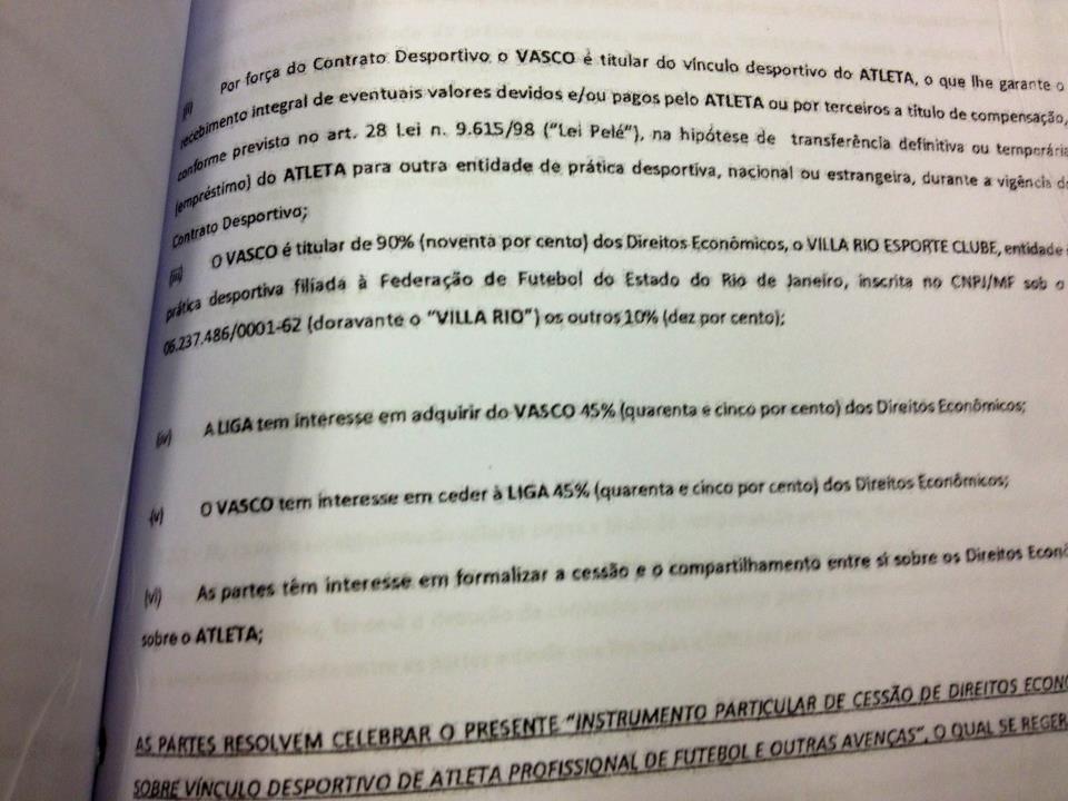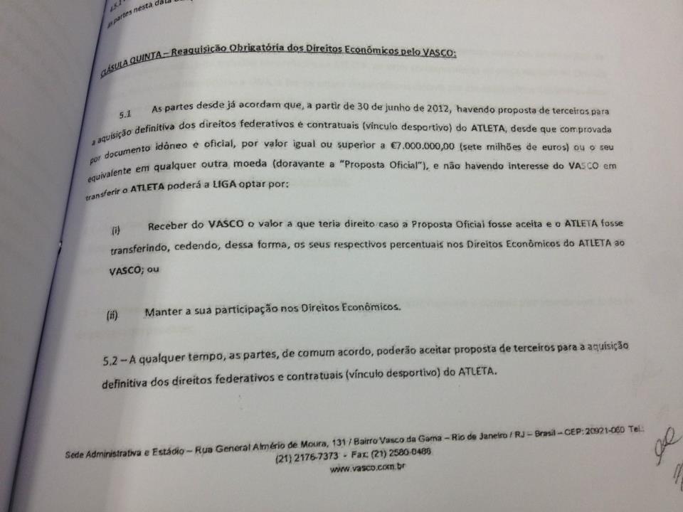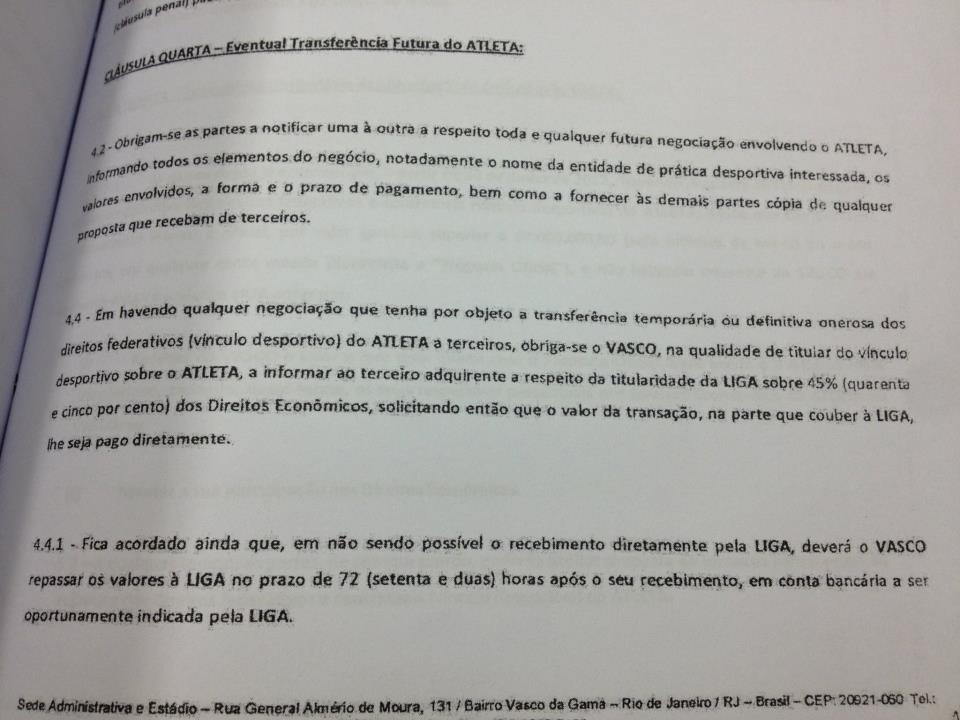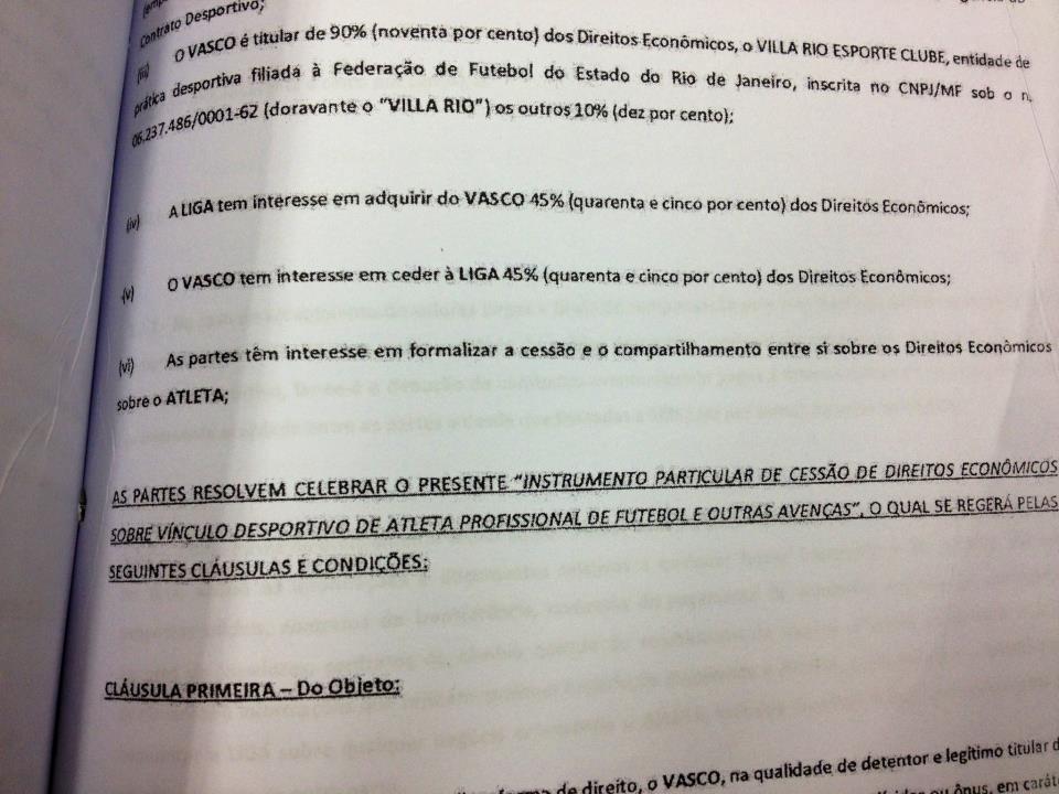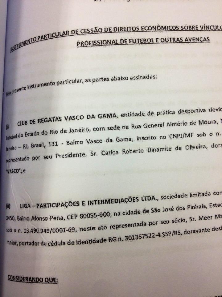 Hoje recebemos através de torcedores do Vasco, uma suposta cópia de um contrato de venda de 45% dos direitos econômicos pela quantia de 1,8 milhao de euros.