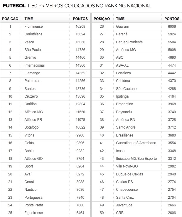 Atual campeão da mundial e da Libertadores, o Corinthians aparece na segunda colocação, com 15.624, seguido por Vasco, São Paulo, Grêmio, Inter, Flamengo, Palmeiras, Santos e Cruzeiro. – os dez primeiros.
