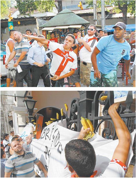 As frutas atingiram os azulejos portugueses e o busto de Vasco da Gama, que enfeitam a entrada de São Januário. As frutas encheram o saguão principal e, por fim, os torcedores espetaram bananas na grade que estava fechada. A situação foi observada de perto por oito policiais que não intervieram. No entanto, a situação ficou mais tensa apenas quando um funcionário do clube reclamou por ter sido atingido por uma banana.