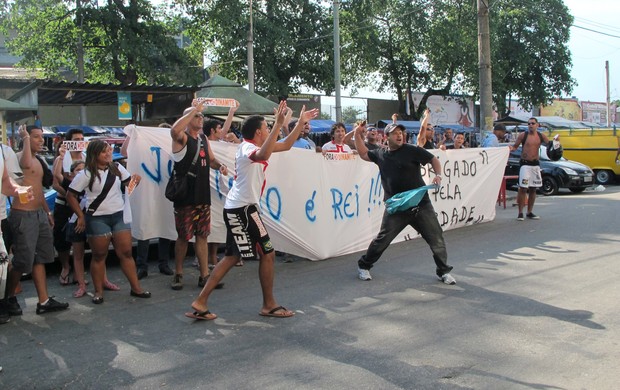 Pela segunda vez na mesma semana, cerca de 50 torcedores se juntou em frente à sede de São Januário para protestar contra Roberto Dinamite. Desta vez, o grupo exibiu duas faixas: “Juninho é rei. Obrigado pela verdade”, numa referência às recentes declarações do ídolo, que classificou o Vasco como um “ambiente sujo”. A outra mensagem era direcionada ao presidente: “O Vasco é gigante. Fora amador. Mete o pé bananite”. Assim como na última terça-feira, os vascaínos atiraram bananas em direção à entrada principal do clube.
