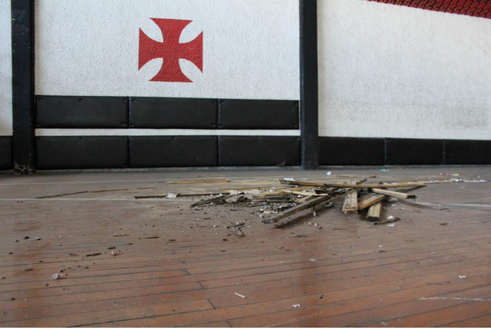 Fotos tiradas em abril e, sete meses depois, em novembro de 2012 mostram o estado do Ginásio Cyro Aranha, o ginásio poliesportivo principal do Club de Regatas Vasco da Gama.