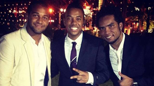 Robinho posou ao lado do cabeça de área Fellipe Bastos e do meia Carlos Alberto, ambos do Vasco, e postou uma foto na internet. Horas antes, ele esteve na loja Hugo Boss do Shopping Village Mall, na Barra da Tijuca, comprando o terno para cerimônia.