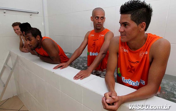 Depois do primeiro treino tático da pré-temporada, os jogadores do Vasco realizaram uma atividade que serviu para aliviar o forte calor de Pinheiral (RJ) e ajudar na recuperação. No momento em que os atletas ainda sentem o desgaste depois de um mês de férias, a imersão na banheira de gelo auxiliou na recuperação e na prevenção das dores pós-esforço de três períodos de trabalho neste sábado.
