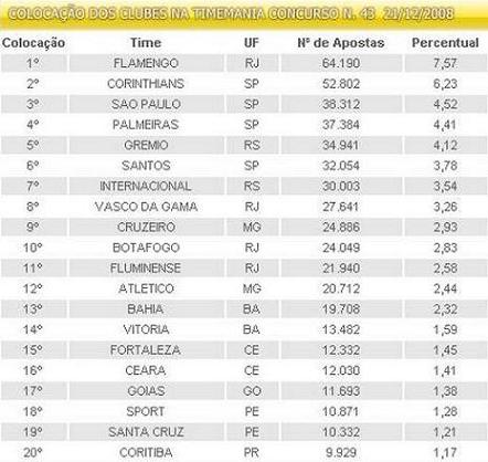 Embora tenha ganho uma posição em relação aos 3 primeiros anos da Timemania, a participação do Vasco no total de apostas vem diminuindo. Curiosamente, os melhores anos do Gigante da Colina se deram nos anos do rebaixamento no Brasileiro (2008) e da disputa da Série B (2009). Confira: