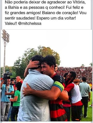 - Não poderia deixar de agradecer ao Vitória, à Bahia e as pessoas que conheci! Fui feliz e fiz grandes amigos! Baiano de coração! Vou sentir saudades! Espero um dia voltar! Valeu!! – postou o jogador.
