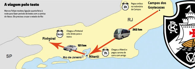 Ano passado, houve uma conversa inicial com o Vasco, mas sem acordo. Na noite de quarta-feira, porém, a diretoria fez contato, pedindo para que o jogador se apresentasse para um período de testes. Começou então a verdadeira maratona, de Campos até Pinheiral.