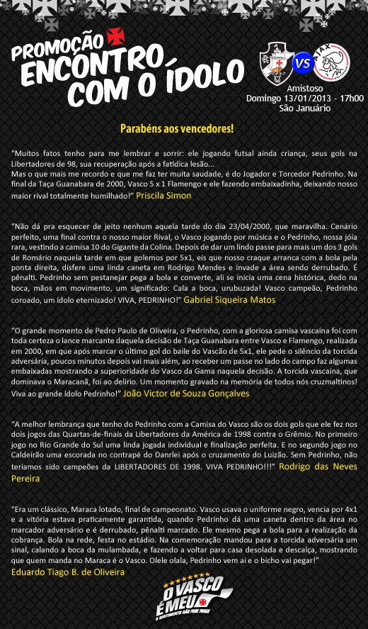 Resultado da Promoção ENCONTRO COM O ÍDOLO! Os sócios vencedores que irão conhecer o ídolo Pedrinho e assistir ao seu jogo de despedida com um acompanhante no Setor Premium de São Januário são: