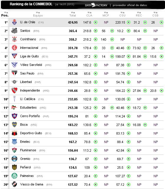 O Vasco, que havia terminado o ano de 2012 na 23ª colocação do ranking da Conmebol, aparece 3 posições acima, em 20º, em na atualização disponível no site da entidade.