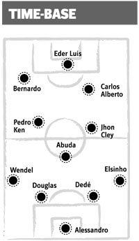 Alessandro, Elsinho, Dedé, Douglas e Wendell; Abuda, Jhon Kley e Pedro Ken; Carlos Alberto, Bernardo e Eder Luis