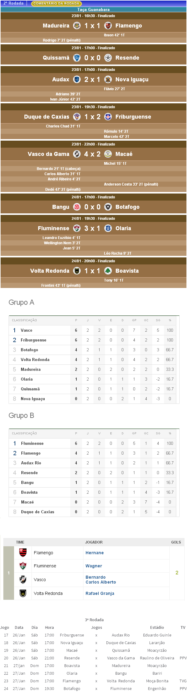 Terminada a 2ª rodada da 1ª fase da Taça Guanabara, que equivale ao 1º turno do Campeonato Estadual, o Vasco, que derrotou o Macaé por 4 a 2, segue líder do Grupo A.