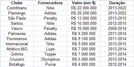 Com as duas torcidas mais numerosas do Brasil e, consequentemente, os maiores índices de audiência na TV, Corinthians e Flamengo oferecem às fornecedoras maior capacidade de venda de produtos e mais visibilidade para as marcas. Independentemente de São Paulo e Internacional terem um histórico recente de títulos ou de o Santos ter um garoto-propaganda como Neymar, as imensas torcidas ainda são mais interessantes para as fabricantes.