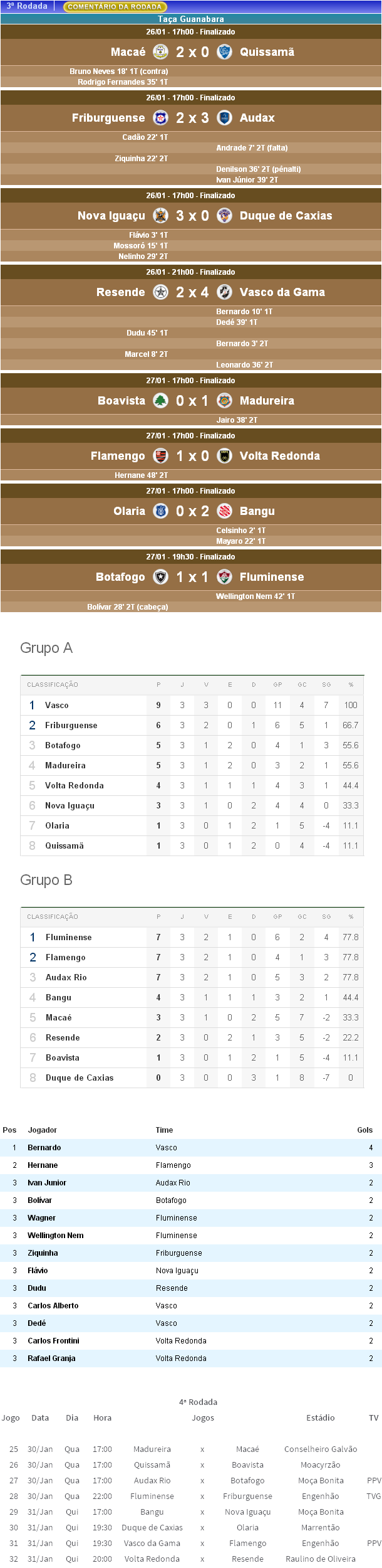 Terminada a 3ª rodada da 1ª fase da Taça Guanabara, que equivale ao 1º turno do Campeonato Estadual, o Vasco, que derrotou o Resende por 4 a 2, segue líder do Grupo A, porém agora de forma isolada e 3 pontos à frente do vice-líder Friburguense.
