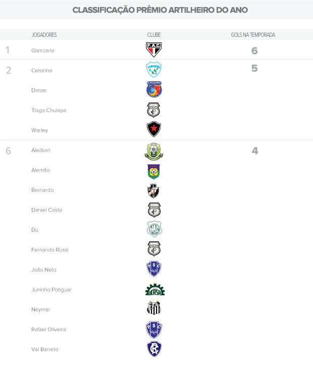 Vencedor de dois prêmios Artilheiro do Ano, em 2010 e 2012, o craque Neymar, do Santos, aparece no terceiro pelotão, entre os jogadores que marcaram quatro gols até então. Ex-companheiro do ídolo santista, o meia Bernardo retornou ao Vasco e parece ter reencontrado o bom futebol, atingindo os mesmos quatro tentos em apenas três jogos no Campeonato Carioca.