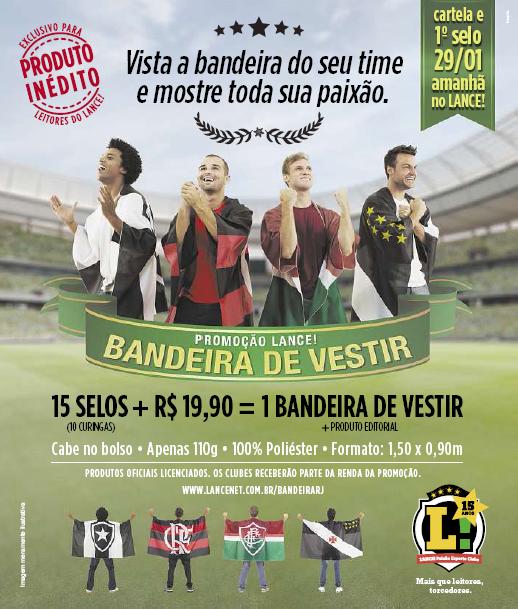 No dia 29 (próxima terça-feira), saem o primeiro selo e a cartela. Cole outros 14 selos em sua cartela e, com mais R$ 19,90, troque por uma bandeira de corpo de Botafogo, Flamengo,Fluminense ou Vasco. E caso perca uma ou outra edição, não se preocupe. E fique tranquilo com seu carnaval: desta vez, o LANCE! publicará dez selos curingas. É só não colar nenhum curinga repetido e a bandeira do seu time de coração fará parte do seu uniforme. Não perca tempo, e colecione!