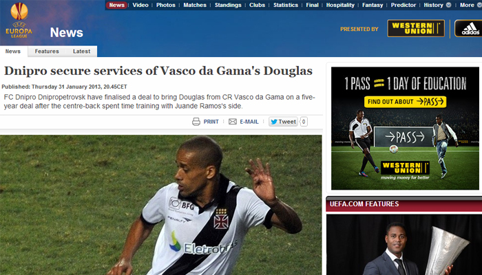 O site da Uefa (União das Federações Europeias de Futebol) cometeu gafe nesta quinta-feira ao noticiar a ida do zagueiro Douglas do Vasco para o Dnipro, da Ucrânia. A entidade colocou foto do volante Wendel para ilustrar a matéria.