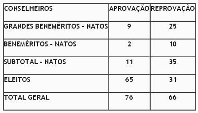 Os 142 componentes do Conselho Deliberativo que compareceram e votaram na reunião, estão assim divididos: 46 Natos e 96 Eleitos.