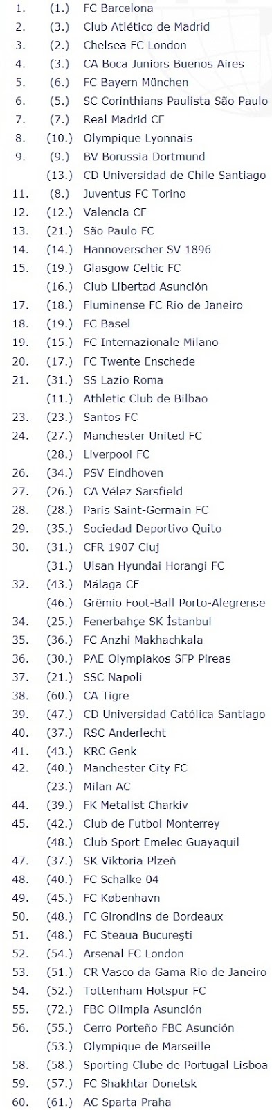 O ranking leva em consideração os resultados obtidos pelas equipes no últimos 12 meses.