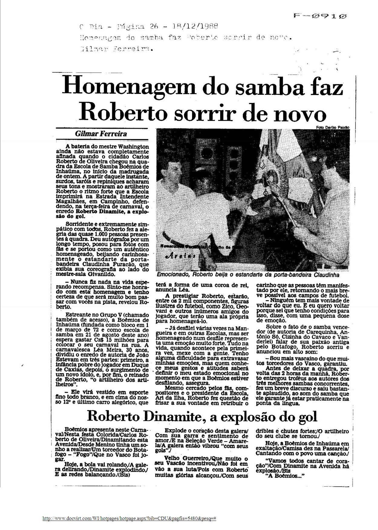 Um fato pouco conhecido da biografia de Roberto Dinamite é que o atual presidente do Vasco já foi enredo de escola de samba. Em 1989, a modesta agremiação Boêmios de Inhaúma homenageou o ídolo e artilheiro vascaíno. Com o enredo "Roberto Dinamite, a Explosão do Gol", a Boêmios obteve o 4º lugar no Grupo de Acesso (equivalente à 5ª divisão) e garantiu a promoção para o Grupo 4 (4ª divisão).