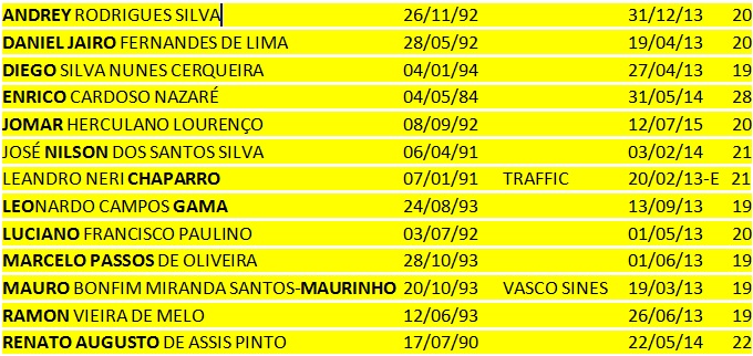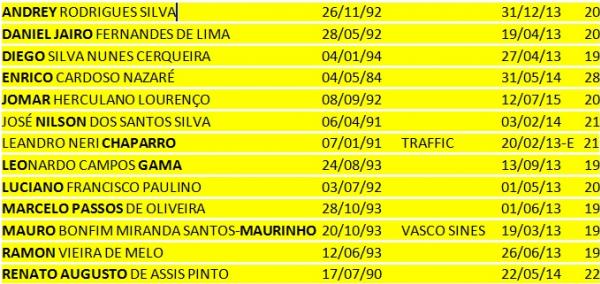 Confira abaixo a lista de atletas que não vem sendo utilizados e ainda permanecem no Vasco. A segunda coluna informa a data de nascimento dos atletas, a terceira a data final do contrato e a última a idade de cada um deles: