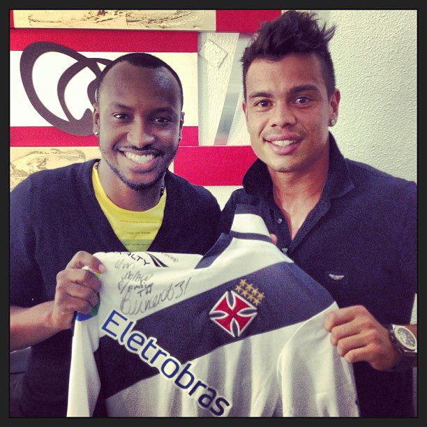 O meia Bernardo postou em sua página oficial no facebook uma foto onde entrega uma camisa oficial do Vasco, autografada por ele, para o cantor Thiaguinho.
