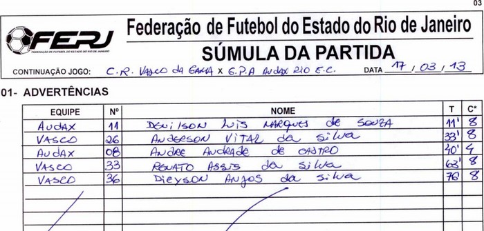 Confira a seção de advertências da súmula de Vasco x Audax. Pelo Vasco, levaram cartões amarelos Dedé, Renato Silva e Dieyson.