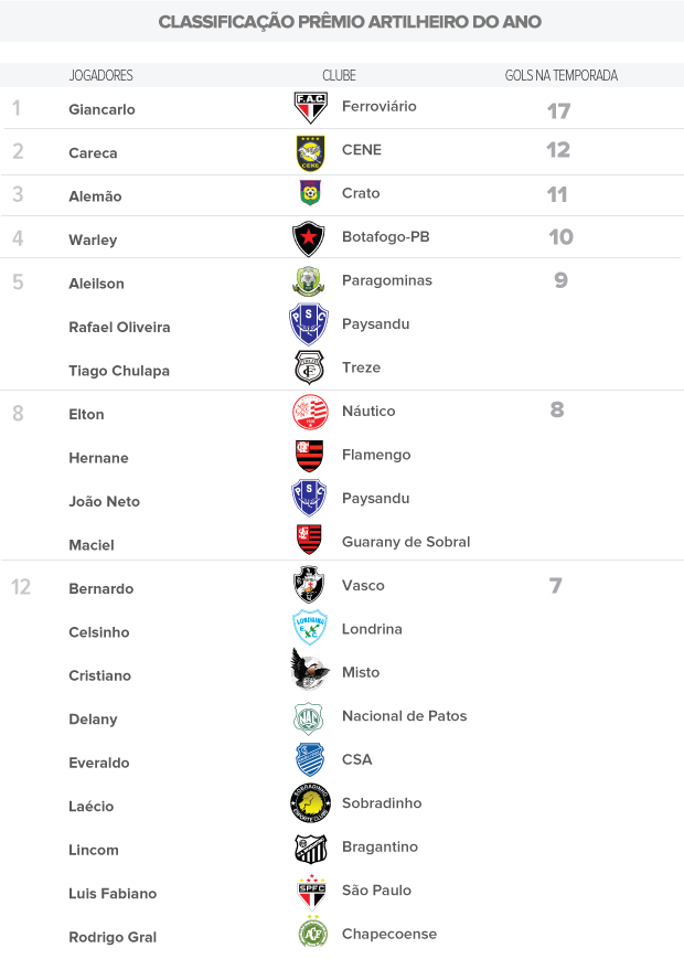 Já o líder do Artilheiro do Ano, Giancarlo, do Ferroviário, terá mais chances de marcar pelo Campeonato Cearense. Com sua equipe classificada na competição, o atacante deixou o dele no sábado, na derrota para o Guarany de Sobral por 3 a 2, e chegou a 17 gols na temporada. Careca, do CENE, e Warley, do Botafogo-PB foram outros a deixarem suas marcas no fim de semana e se mantiveram na briga pelas primeiras colocações.