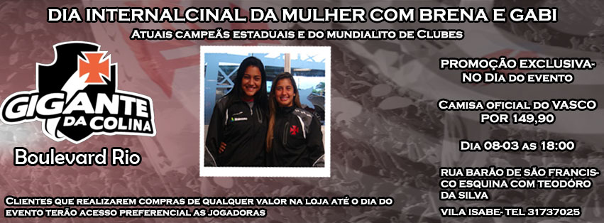 Em comemoração ao Dia Internacional da Mulher, a loja Gigante da Colina do Boulevard Rio Shopping (antigo Shopping Iguatemi), fará uma homenagem ao futebol feminino do Vasco, promovendo uma tarde de autógrafos com a atacante Gabrielly Soares e com a meia Brena, a partir das 18h de sexta-feira (08/03).