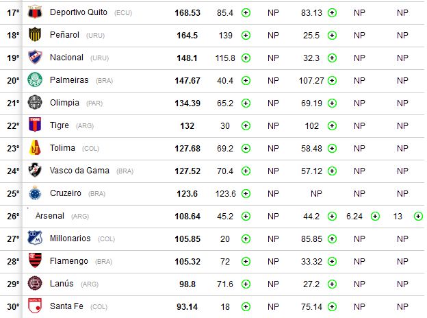 Em ranking divulgado nesta quarta pela Confederação Sulamericana de Futebol (Conmebol), o Gigante da Colina aparece na 24ª posição. O ranking da Conmebol contabiliza a participação dos clubes nas últimas cinco edições dos torneios internacionais considerados oficiais pela entidade: Libertadores, Sul-Americana, Recopa Sul-Americana, Copa Suruga e Mundial de Clubes. Confira os 30 primeiros colocados.