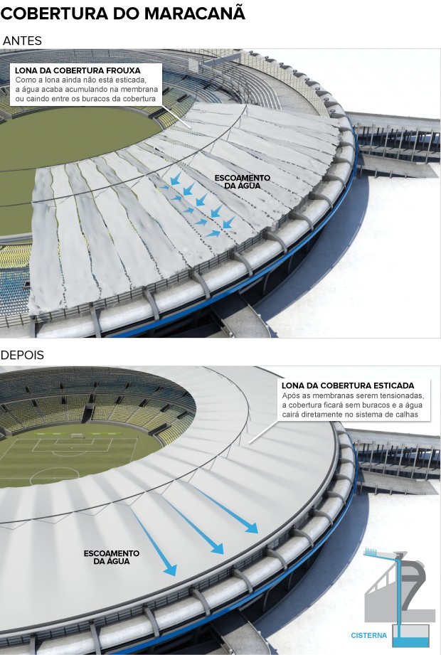 E o que fazer com toda a água que cair na cobertura em dias de chuva? Pelo menos metade dela será reaproveitada no próprio Maracanã, segundo a Emop. A água será captada e drenada por 60 calhas de concreto em um sistema de sucção a vácuo. Depois, seguirá para dois reservatórios subterrâneos com filtros para tratamento e posteriormente será direcionada para uso não potável nos banheiros.